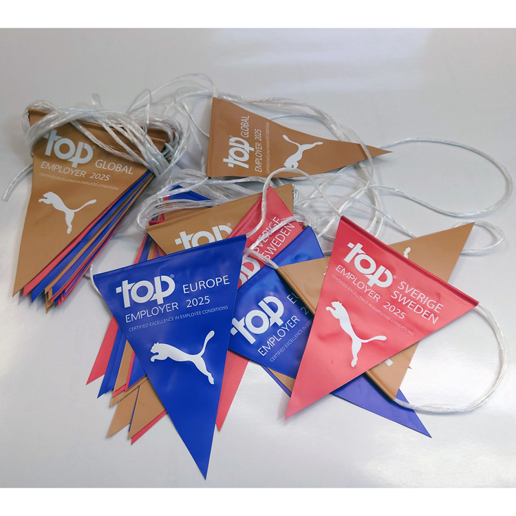 Svar: Flaggspelen digitalprintas i CMYK-färg. Guld, silver, metallic och liknande går dessvärre inte att beställa.